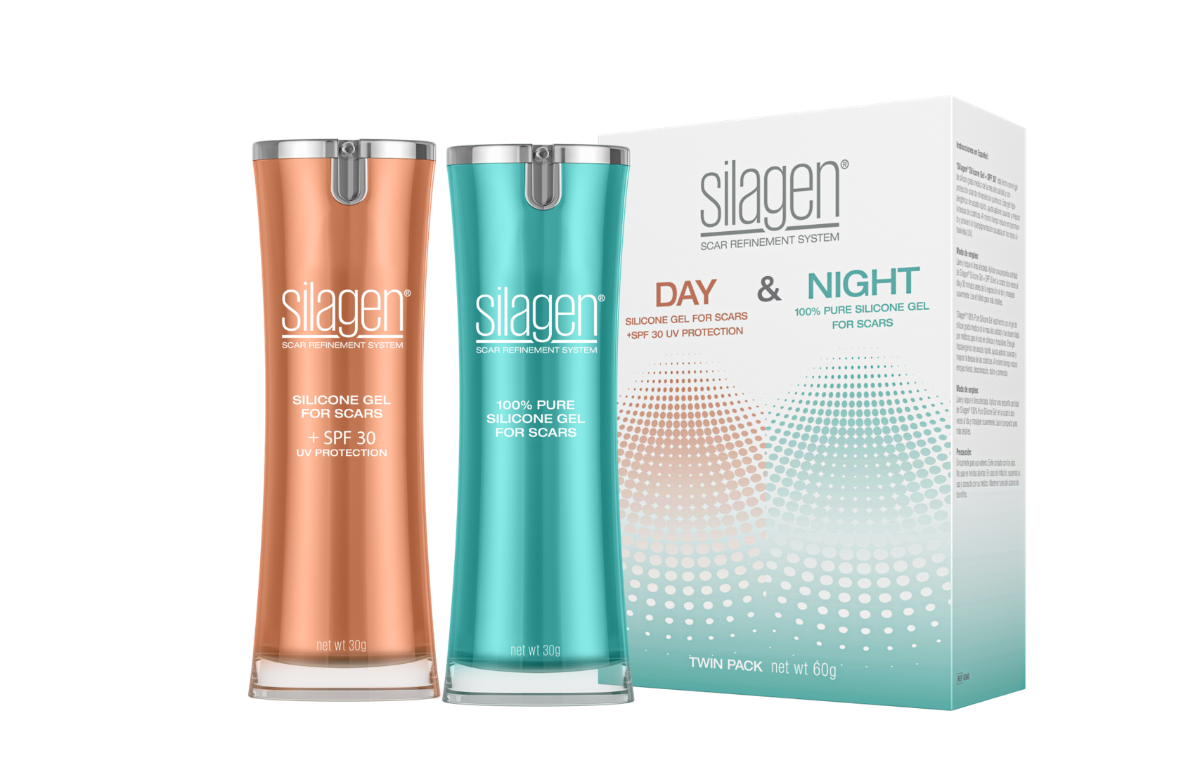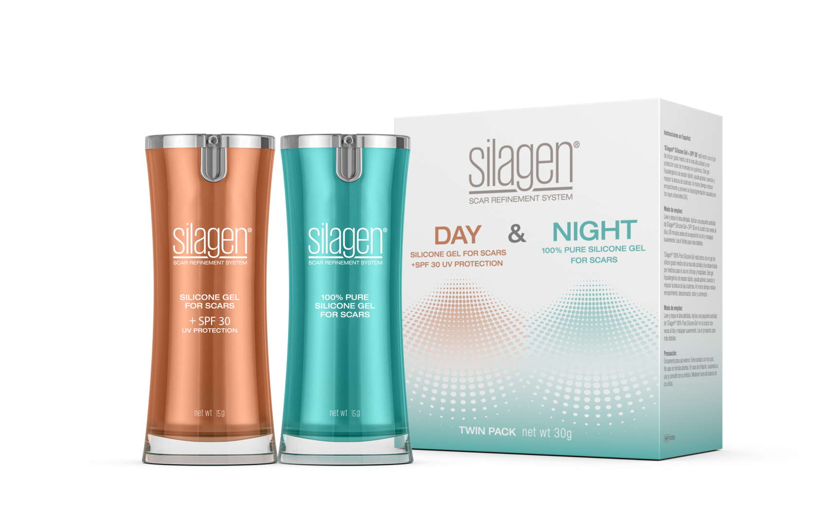 The Silagen Gel Day / Night Twin Pack offers both the Silagen 100% Pure Gel and the Silagen SPF+30 Gel together in one convenient package. Use the Silagen SPF+30 Gel during the day to protect your scars from harmful sun rays and the 100% Pure Gel at night.